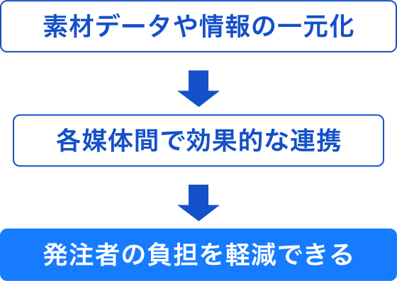 複数の販促ツールへの展開を1つの制作会社に発注できることで、貴社の発注担当者の負担を大幅に軽減。情報やデザイン素材を他媒体に流用展開しやすく、スピーディーかつ高品質な制作が可能となります。